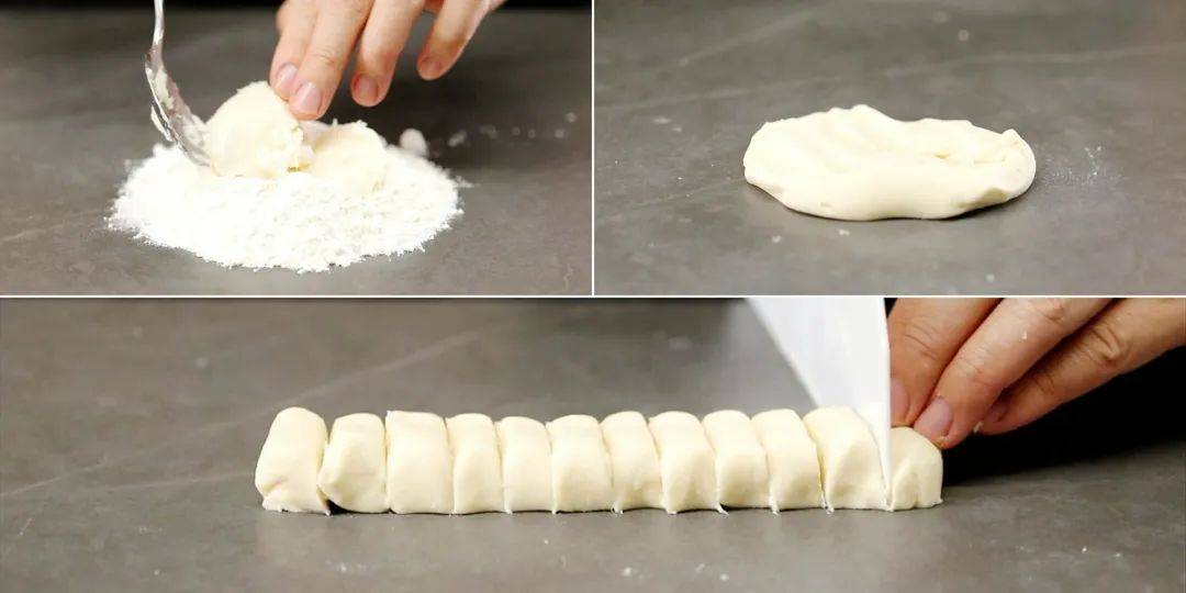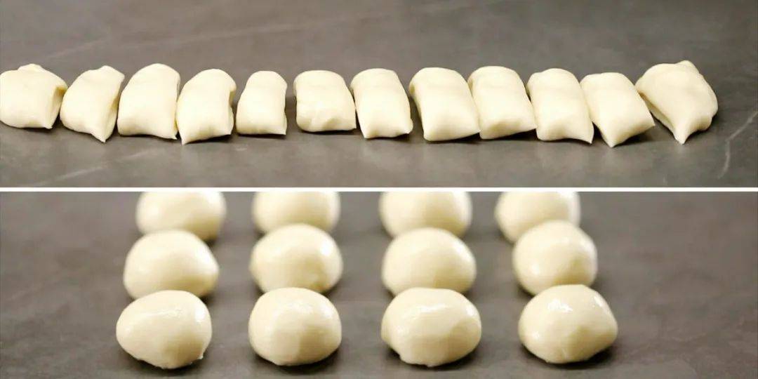 将切好的小面团用从周围不断往底部收的方式,整成圆形。所有小面团都揉圆以后,盖上保鲜膜松弛15分钟以上。