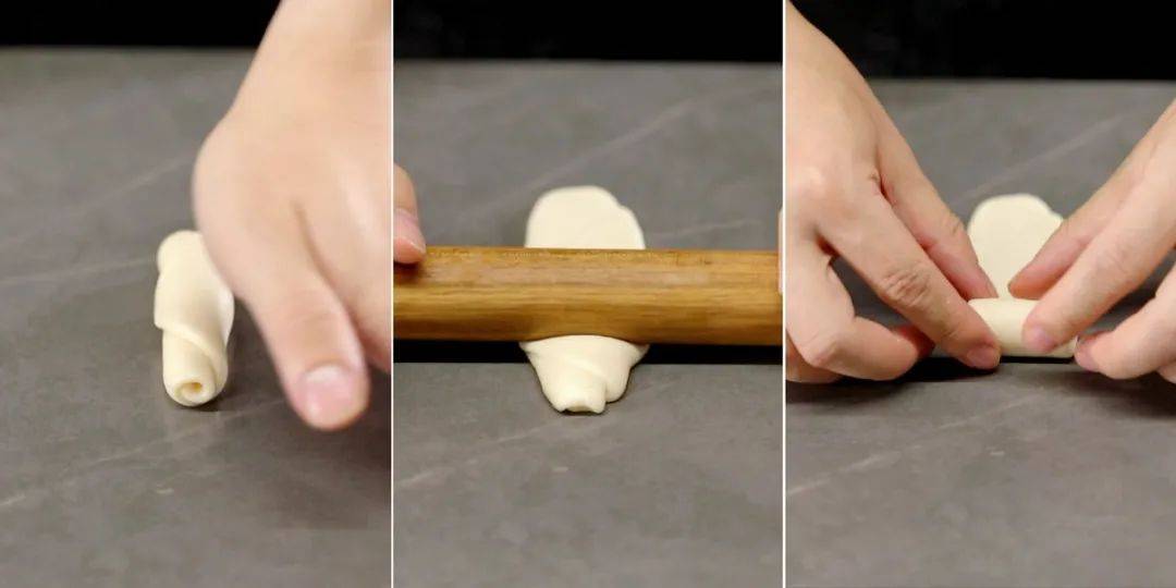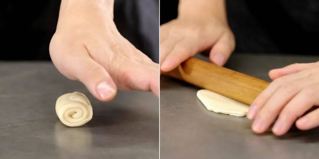 将这个细长条面团在台面上转90度,压扁,再次擀开,并且再次卷起来。这一次卷起来以后得到了一个短短的小面卷。