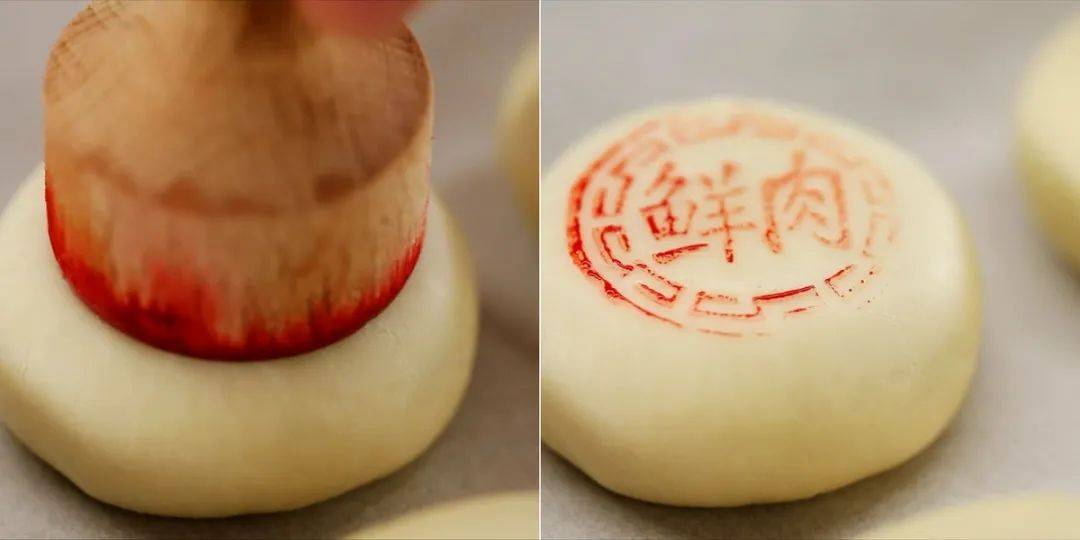 最后,在月饼表面盖上鲜肉两个字的红色食用色素章。如果没有这一步也可以不做。