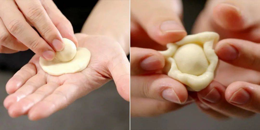 取一个 水油皮面团 ,在手心压扁。 然后放一个 油酥面团 ,包起来。 将水油皮面团往上推,直到收口。