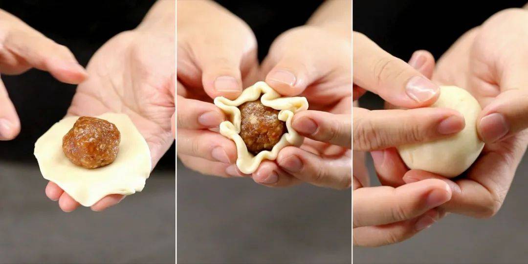 把肉馅放在面皮中心,就可以包了。将面皮慢慢往上推,直到收口。收口要仔细捏紧,避免烤的时候露馅。