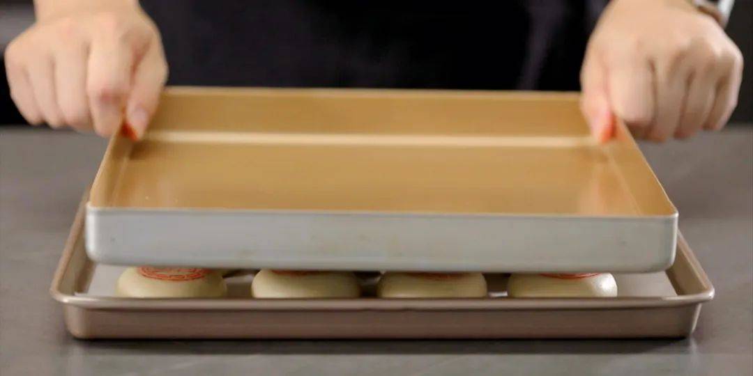 进烤箱前还有最后一步。在月饼表面再压一个空烤盘。这样可以帮助我们烤出扁平的月饼。放入烤箱中层或下层,上下火200℃烘烤大约25分钟就可以出炉了。
