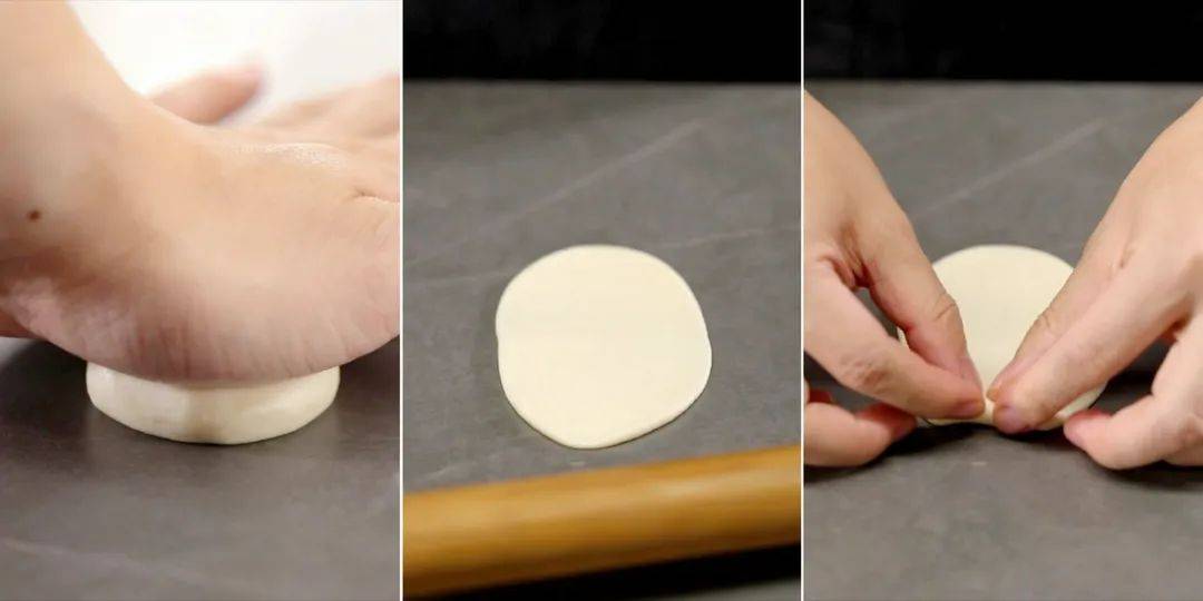 如果你之前水油皮面团和面不够软,这个时候面团太干就不太好收口了哦。收口处可以蘸一点点水,让面皮更顺利黏合在一起。 水油皮面团一定要足够软!再次强调哦!