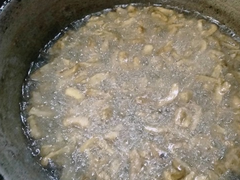 6.油温七成下入香菇丝,炸好后捞出,等待油二次升温,下入香菇丝进行复炸