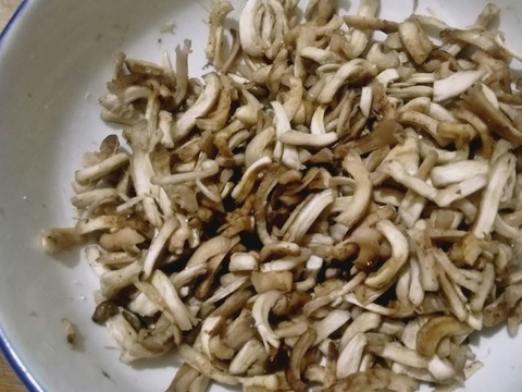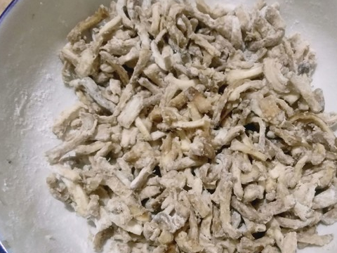 4.撒上面粉,拌匀,让每一根香菇丝都裹上面粉。