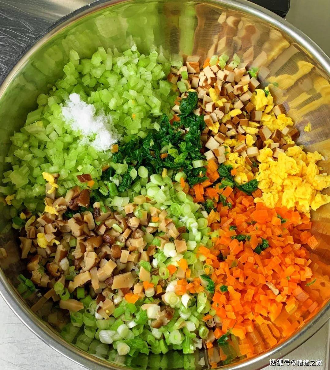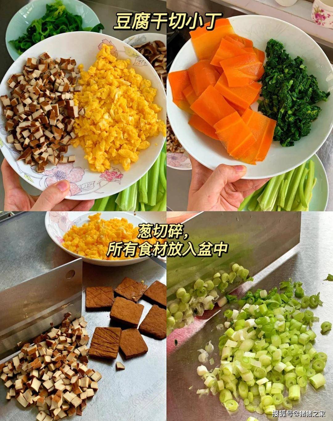 2.鸡蛋炒熟切碎;芹菜焯水切碎;胡萝卜开锅蒸5分钟切碎;干香菇提前泡一晚,然后开锅煮3分钟切碎;豆腐干切小丁;小葱切葱花。全部食材准备好后倒入空盆中,加入适量盐、花生油,搅拌均匀。