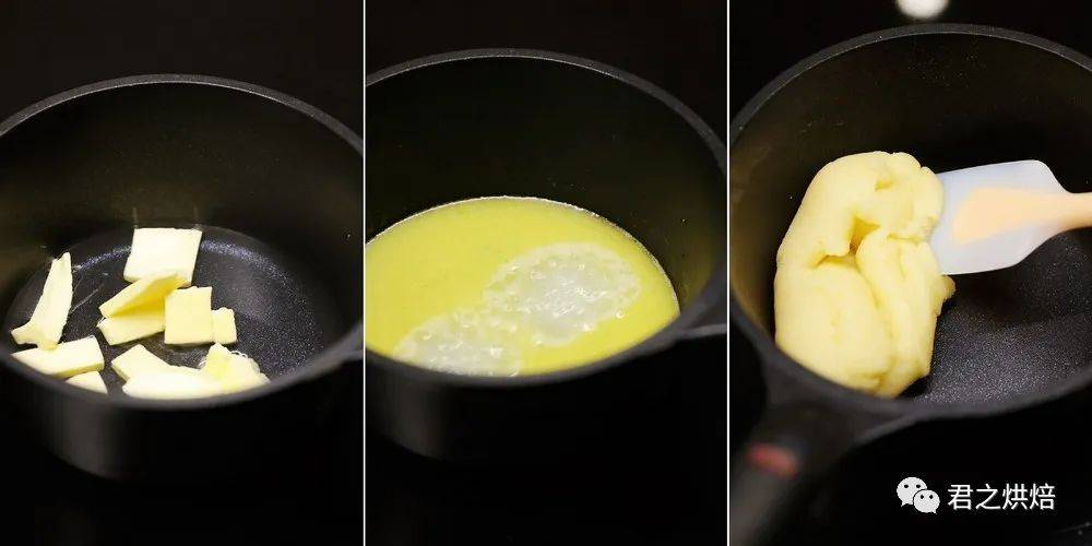 将切成小块的黄油倒入奶锅里,加入水和盐。用中火加热,直到黄油完全融化,水煮至沸腾。