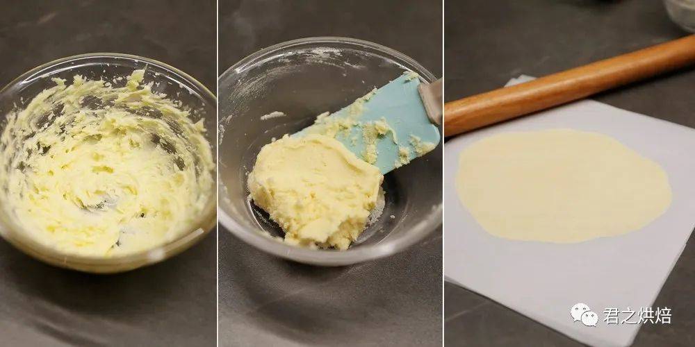 黄油软化以后,加入糖粉,用电动打蛋器打至蓬松。然后加入过筛后的面粉,用刮刀拌匀,成为酥皮面团。