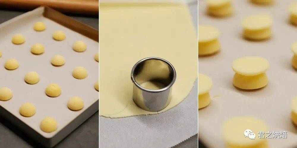 冻硬的酥皮面团,用大小合适的切模(和小半球的直径一样大或者稍大一些都可以)切出圆形面片。然后放在泡芙面糊顶部。