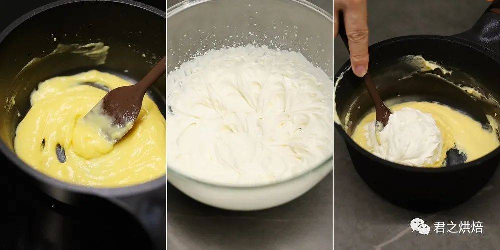 将1/3打发的淡奶油和上一步煮好并降温的卡仕达酱混合。充分拌匀。