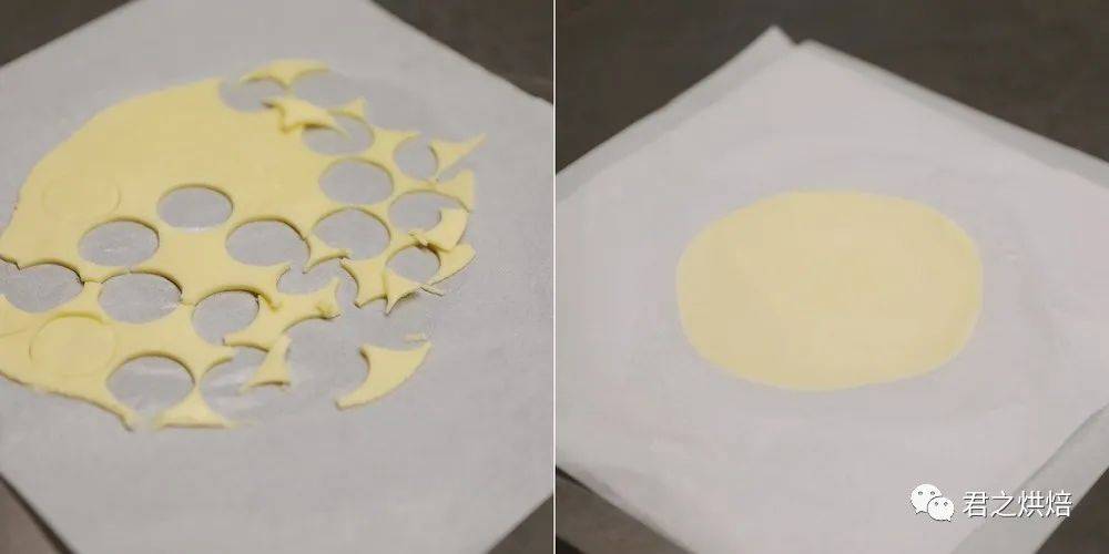 酥皮面团的边角料可以用刮刀铲起来重新团成圆形,放在油纸中间再次擀开,冻硬以后再次用切模切割。