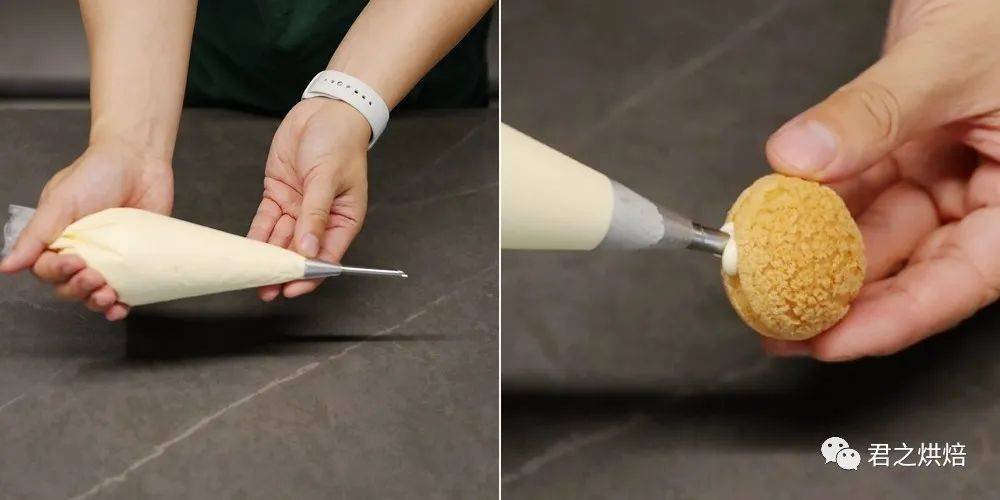 将香草奶油馅装入裱花袋,用泡芙专用裱花嘴。用手按着泡芙花嘴,将它插入完全冷却的泡芙里,满满的挤入馅料。这样一份可口的小酥皮泡芙就做好了!
