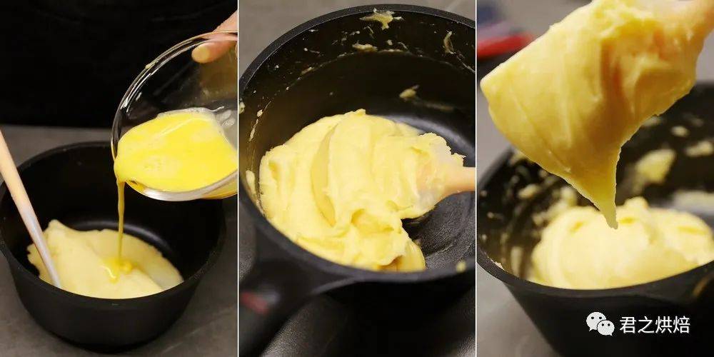 配方中的蛋液供参考,可能会比这个多也可能比这个少,关键看面糊状态。用刮刀挑起面糊,能形成上图右边的倒三角形状,就说明稀稠度合适了。