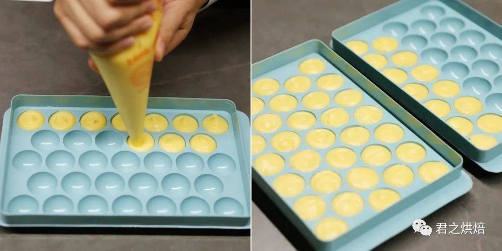 将泡芙面糊装入裱花袋,然后挤入模具里。全都挤好以后,用手指蘸水将表面的小尖尖按平。这个配方我一共挤了46个小半球。之后将模具放入冰箱冷冻(-18℃)。