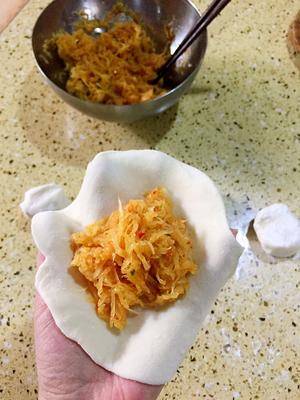 在等待萝卜丝出水的过程中,可以准备其他的配料。葱、姜切成末,与萝卜丝一同放入盆中。再加入适量的胡椒粉、鸡精、香油等调味料,搅拌均匀。此时,萝卜馅已经散发出诱人的香气。