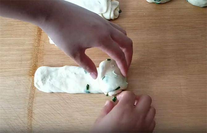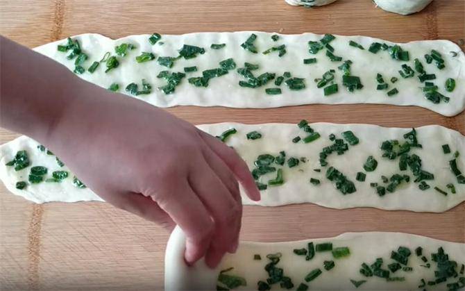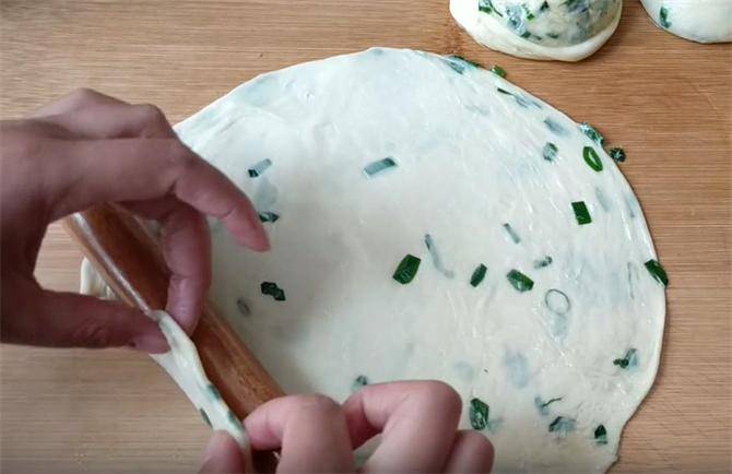 6.做好之后,我们按压排出里面的空气,再次把它抻长按扁,然后边向后拉伸边卷起,这样做饼的层次非常的薄,而且丰富。