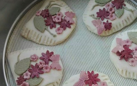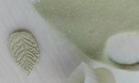 7.开始制作表面装饰品,将调好颜色的面团擀成薄片,用模具按压出喜欢的图案