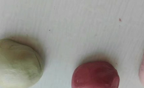 3.取出少量原色面团分别放入抹茶粉,红曲粉(少放就是粉色)肉揉均匀
