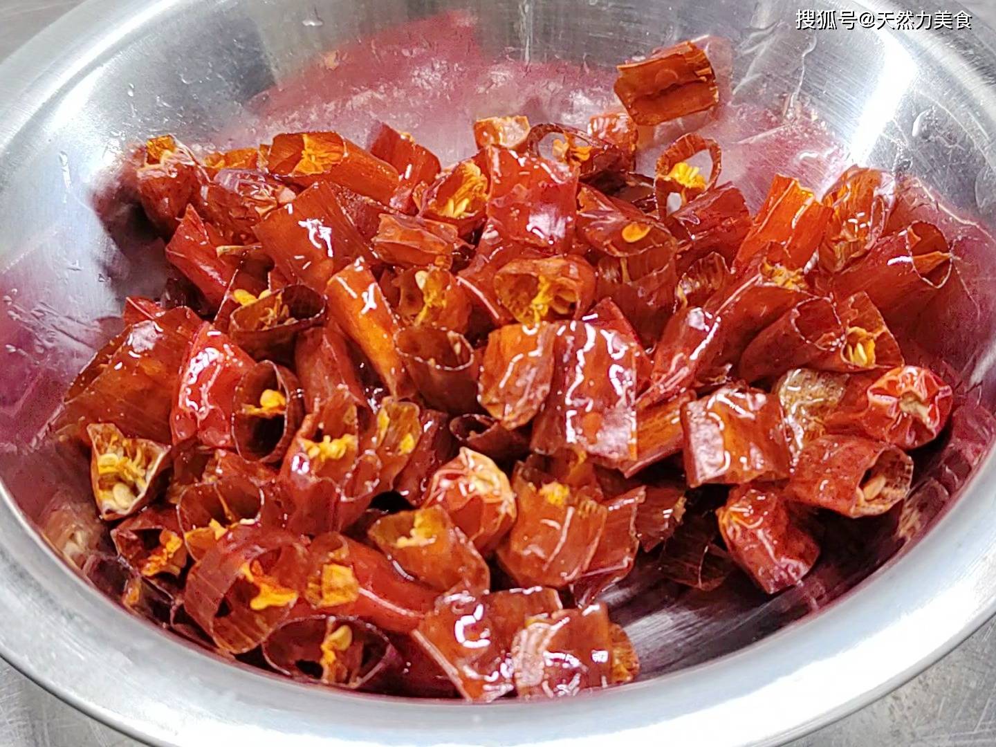 7、干辣椒是用来增辣提香还有配色的,用剪刀把干辣椒剪成小段,把剪好的辣椒段用漏勺把辣椒籽筛掉。把辣椒段放盘中,然后加入30克食用油搅拌一下,让所有的辣椒段都能裹上一层薄薄的食用油,这样在后期煸炒的时候就不容易炒糊变焦,颜色好看也更香。
