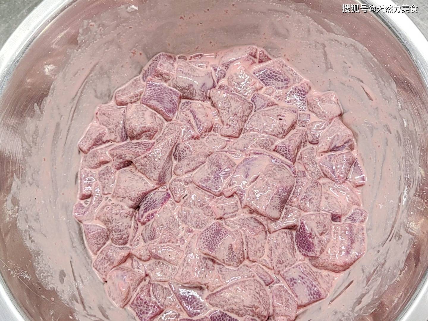 5、把控干水分的猪肝倒入盘中,接着就可以调味,加入1克食用盐提味,2克鸡精提鲜,1克白胡椒粉去腥增香,10克料酒去腥增香,下手搅拌均匀,让所有的猪肝都能均匀地吸收调料的味道。抓拌均匀后再加入20克玉米淀粉,下手抓拌均匀,让猪肝均匀地裹上一层玉米淀粉,抓拌均匀后放一旁腌制15分钟。