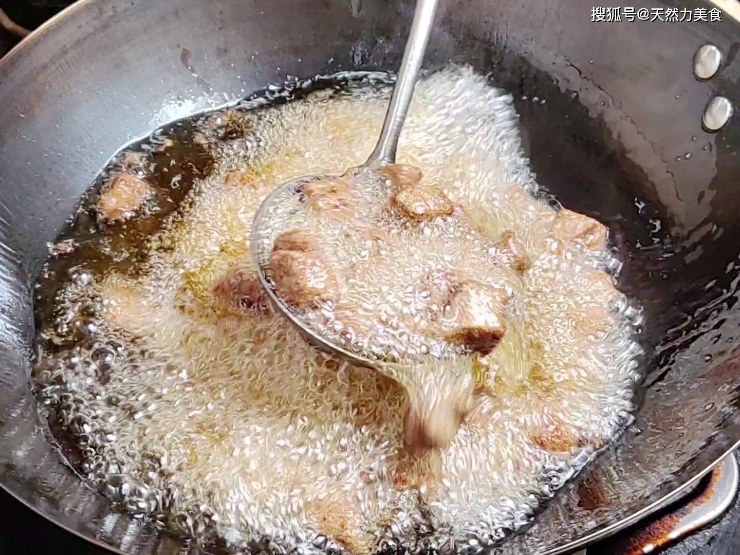 2、猪肝捞出后就改大火把油温升上去,我们要对猪肝进行复炸,复炸的目的就是要让猪肝的外表带点酥脆的口感。等油温升到6成热的时候就把猪肝再次倒入锅内进行复炸,猪肝下锅后要多搅动,让猪肝受热更均匀,复炸时间不用太久,最多有30秒左右就要倒出控油备用。
