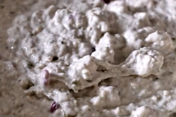 2:打好的绿豆泥可以过滤一遍,把里面的渣渣过滤出来,再加上面粉、玉米粒、酵母和白糖搅拌均匀,面粉可以少量多次放进去,搅拌成粘稠的面糊即可。