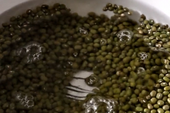 第一步:准备一把绿豆放在碗中,加上温水浸泡2个小时,准备一根玉米掰下玉米粒,绿豆浸泡好后,要清洗几遍,然后放在料理机中,加上适量的清水,打成绿豆泥。