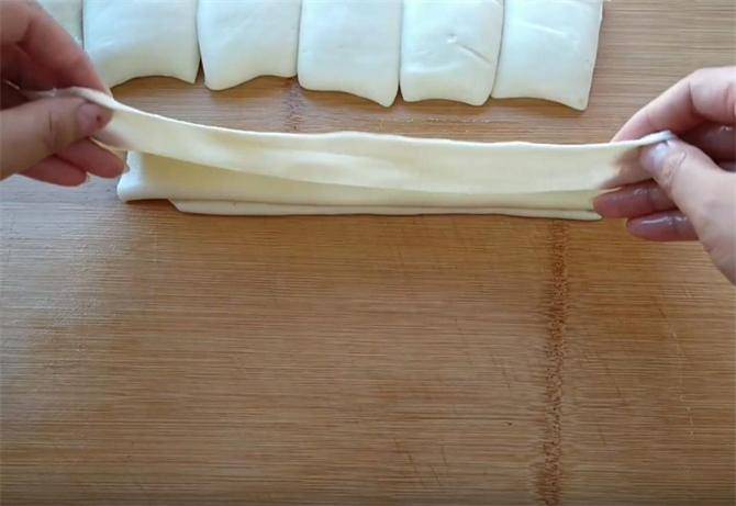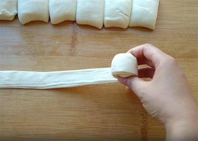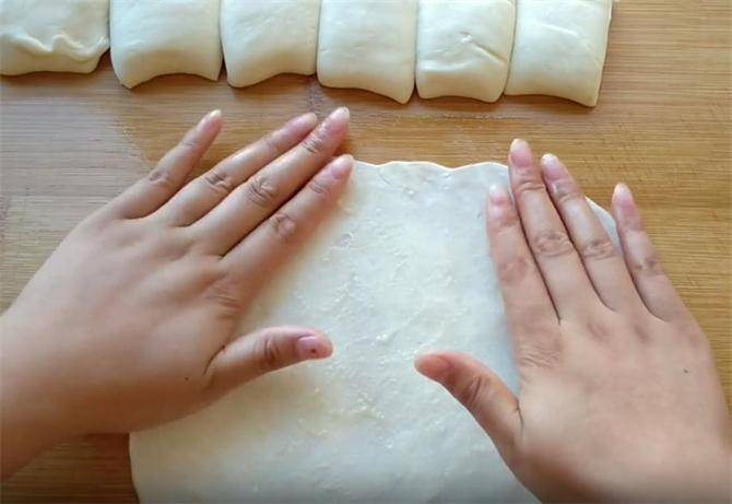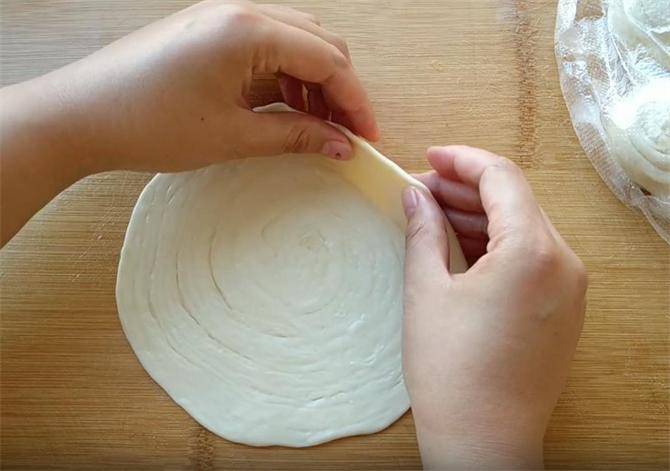 7.接下来我们把面皮抻长按扁,用手挤出里面的空气,这样做能够使饼的层次更加的薄,从一端卷起,要尽量卷的整齐一些。