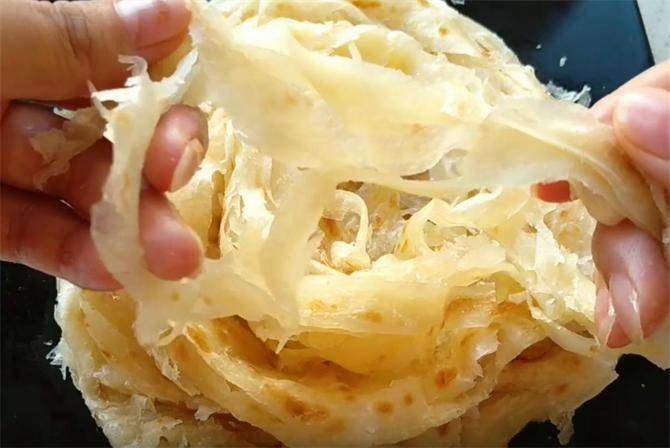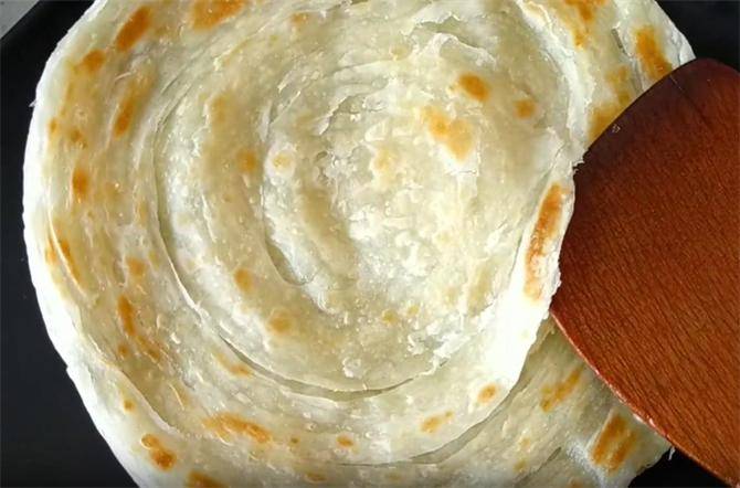 11.由于烙制的时间短,水分保留,所以说这个饼特别的柔软,如果喜欢吃表皮酥脆的口感,也可以多烙制一会儿,像这种程度就可以,总结两点,要想做出的饼柔软筋道,层次丰富,第一就是做好的饼坯一定要松弛十分钟以上,第二点就是尽量减少饼在锅内的烙制时间,保留水分。