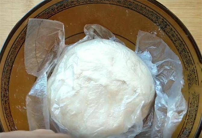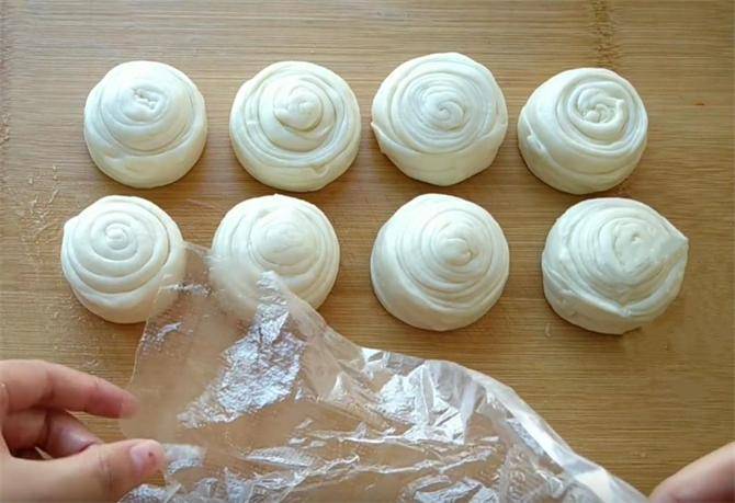 8.尾部压在饼坯的底端,我们生坯就做好了,饼坯做好以后,我们盖上保鲜膜松弛十分钟,这样更容易擀开,而且做出的饼也更加柔软,用手按压基本不回弹即可。