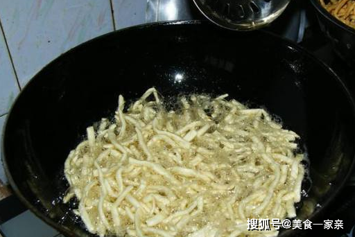5、坐油锅,待油温热后,中火,炸面条,炒至金黄捞出,沥油