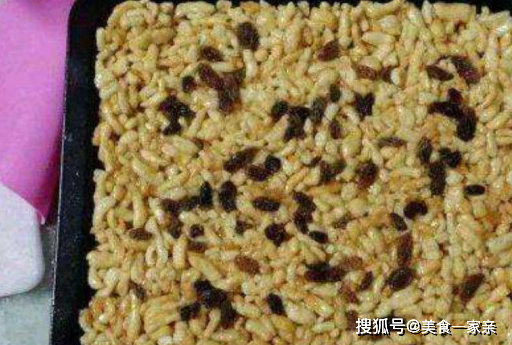 10、把裹上糖浆的面条倒入模具中,压实,然后撒点炒香的芝麻,待冷却后切块即可食用