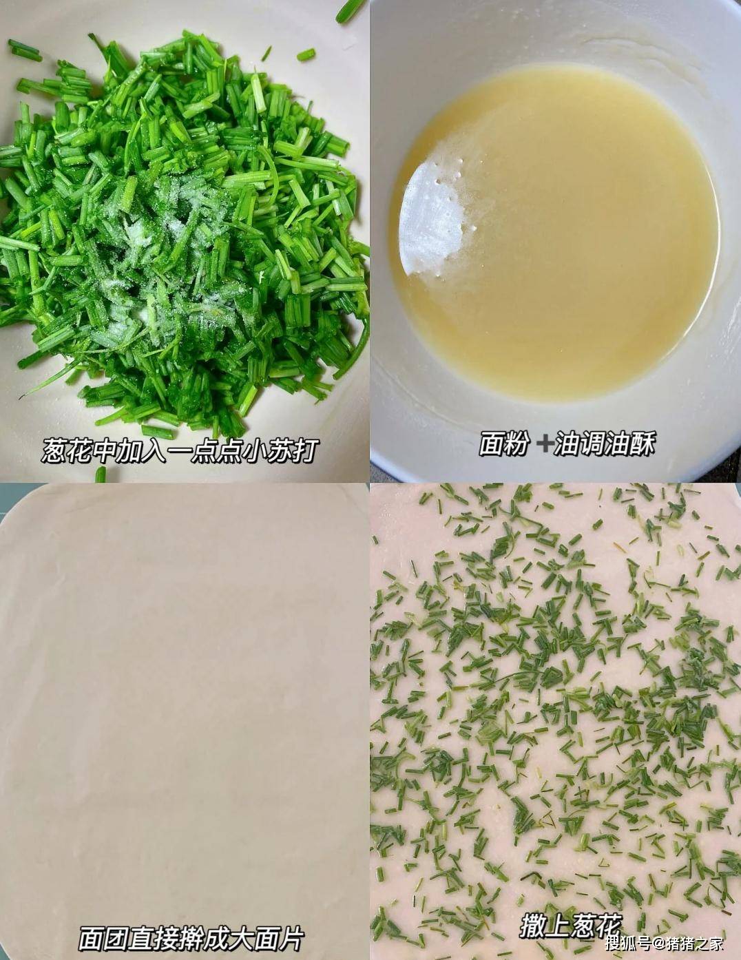 3.擀片抹酥 :面团擀成大大的一张薄片,油酥均匀抹上去,再撒上葱花,香气四溢,已经开始期待成品了!