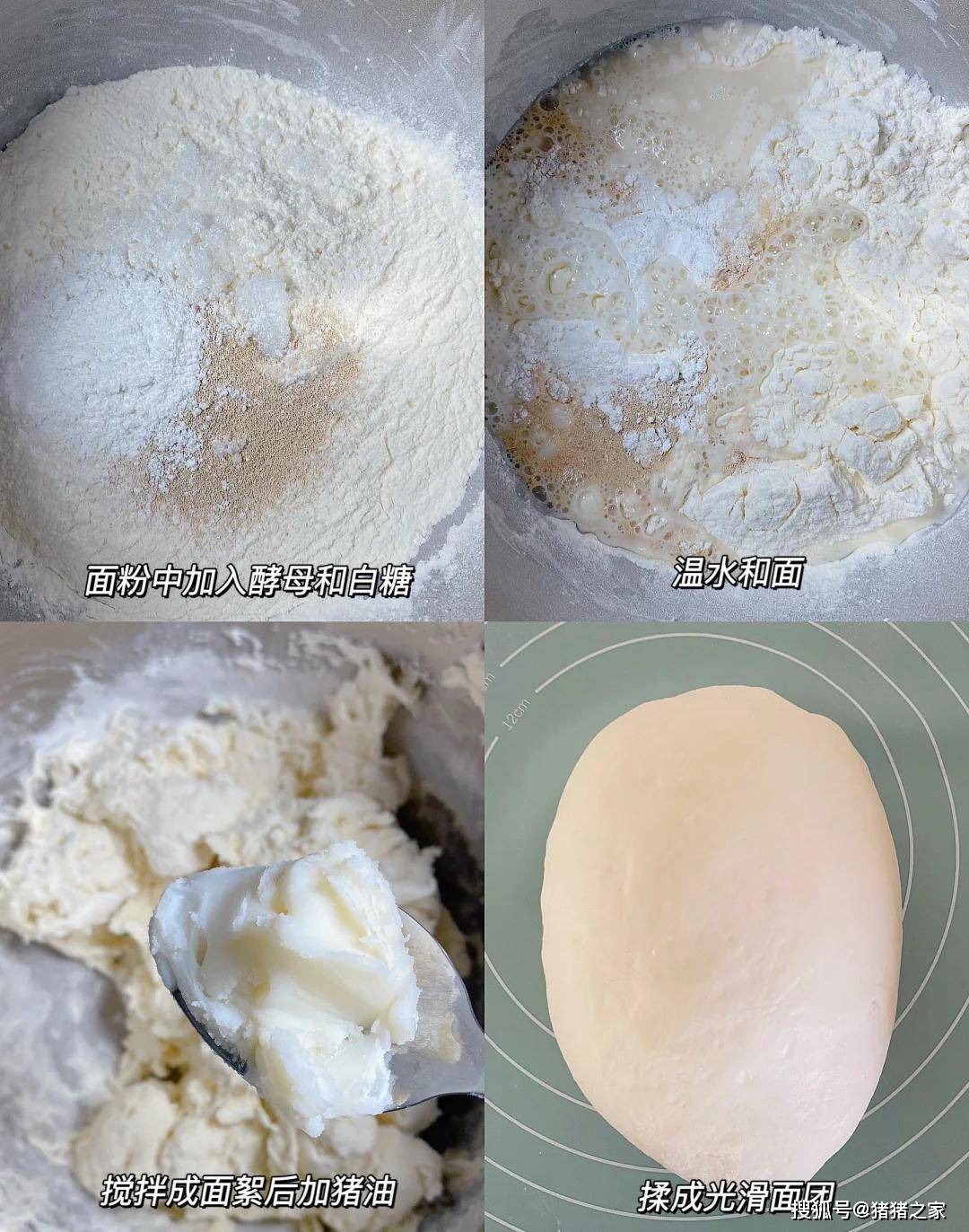 1.和面 :面粉里加白糖、酵母,温水慢慢倒,边倒边搅,变成面絮状。然后,猪油上场,揉啊揉,直到面团光滑又柔软。