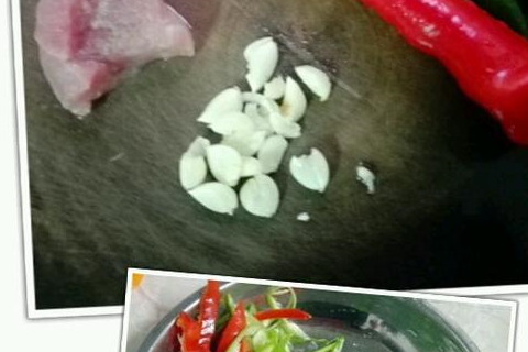 2.辣椒,瘦肉,蒜头都洗干净切好,如图所示