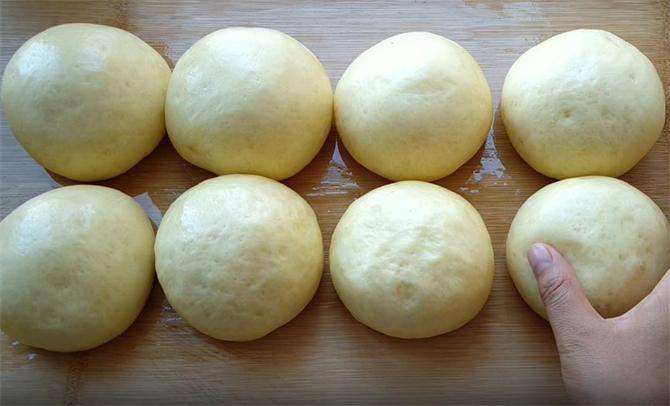 6.接下来我们在案板上刷一些油,在生坯上面也刷一层油,防止粘连,然后生坯之间要留出足够的空隙,防止醒发时互相粘连,醒发至原来的三倍大,拿起来轻飘飘的即可,只有醒发到这种程度,下锅后才会漂浮在油面上,这样炸制才能形成汉堡中间的那一圈白色。