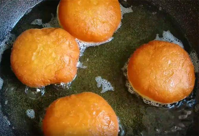 7.起锅开小火,油温四成热就要下入生坯,如果油温过高的话,表皮很快就会变糊,内部还没有熟透,炸至底面金黄,我们轻轻的翻面,炸至两面都成金黄色即可出锅。