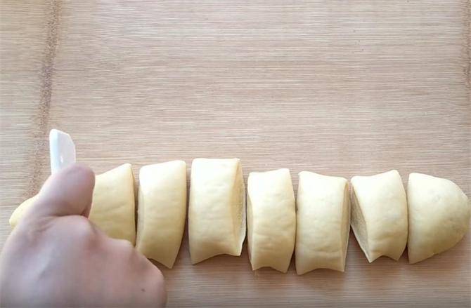 2.接下来我们把发好的面揉搓排气,一定要多揉一会儿,排净里面的空气,这样二次醒发的时候口感才会更加细腻,把面团搓成长条状,下八个左右的面剂。