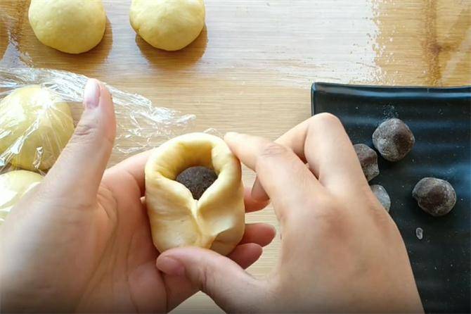 5.我们把面剂像这样捏成中间厚边缘稍薄一点的面皮,包入豆沙馅,用包包子的方法收口,虎口转动收紧,然后把它团圆,整理的更加平整。