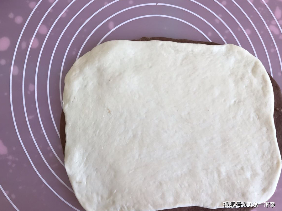 12.重复上面的拌匀,白色面团也擀成和可可面团同样形状大小的薄片