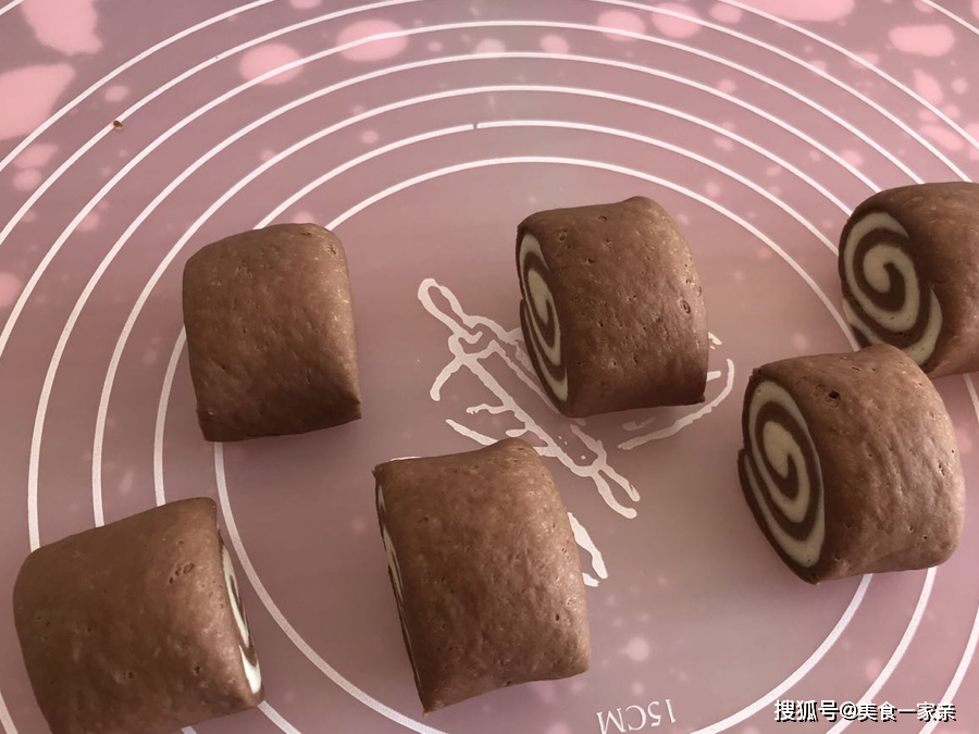 15.将卷好的圆柱体,切成小段,宽度可依据个人喜好决定,也就是馒头的大小,我们就得到棕色外皮的双色馒头