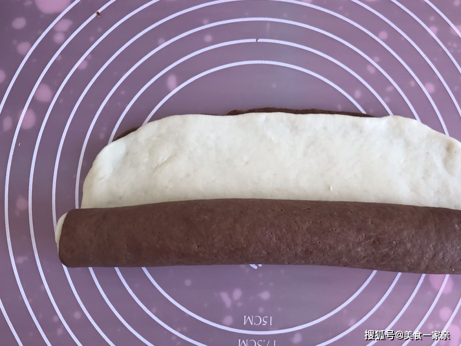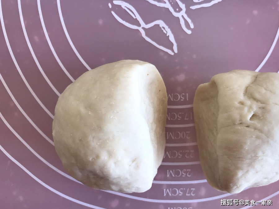 11.白色面团醒发完成后,同样取出揉面排气,平均分成2份