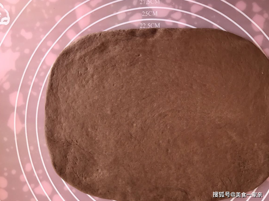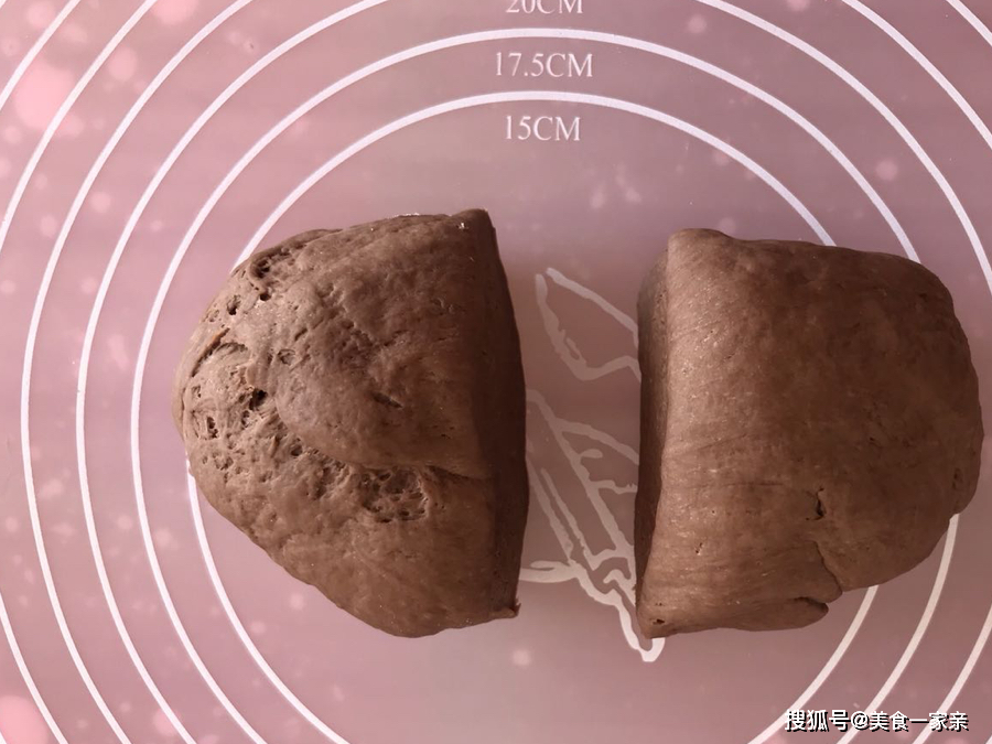 9.醒发约1.5小时后,面团体积膨胀,将可可面团取出揉面排气,平均分成2份