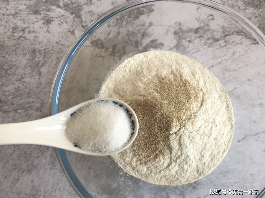 2.接着加入10克白糖,白糖可以有效的促进发酵,所以做发面面食要加入适量白糖