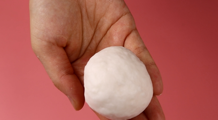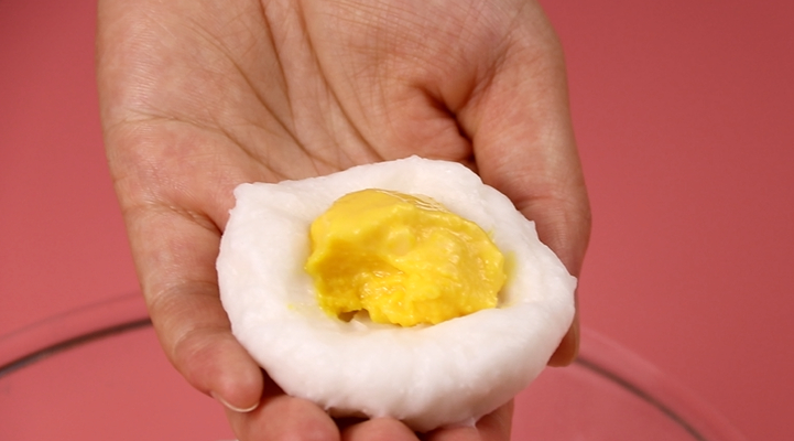 取一块面团,搓圆压扁,包入流心馅儿,包好。