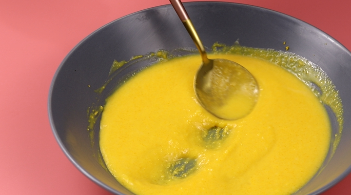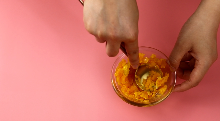 取四个咸蛋黄上锅蒸熟。取出,用勺子压碎,再用漏勺过滤一下,使咸蛋黄更加细腻。(咸蛋黄直接筛是筛不出来的,需要用勺子碾压漏勺。)