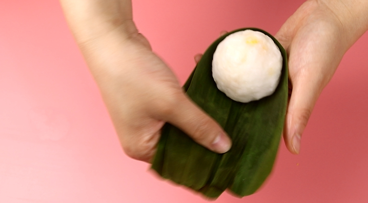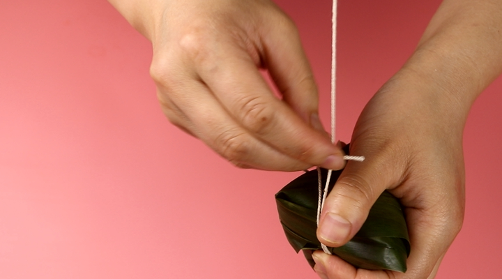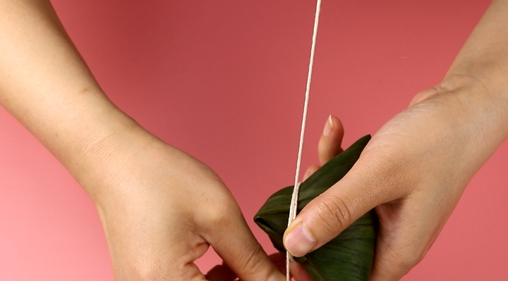 取两片粽叶,折成窝状,放入包好的面团,将粽子上面的多余的叶子盖下来,折好,用绳子绑住,这个粽子就包好了。