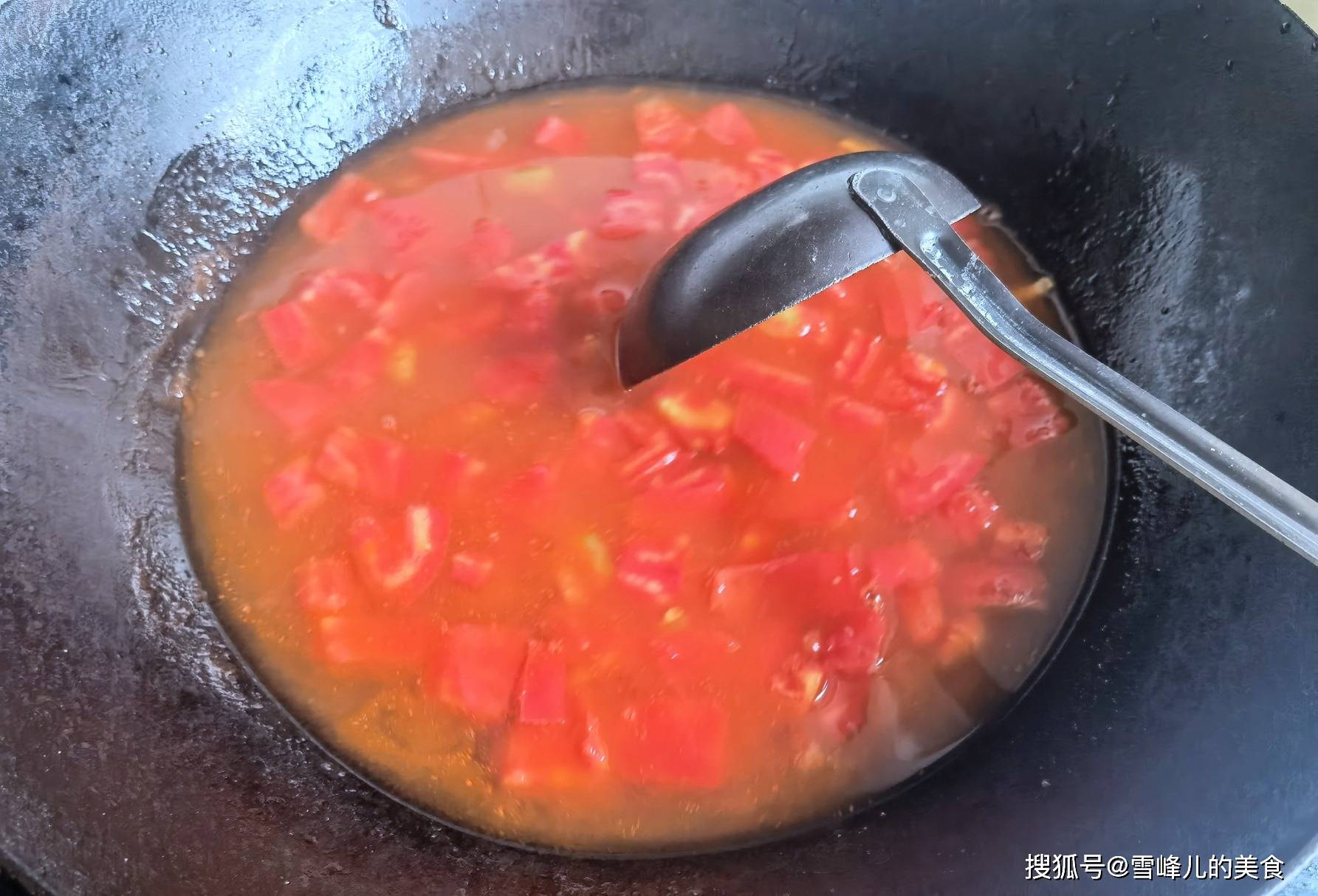 第二步:西红柿用了4个,去皮切成小丁,如果嫌弃麻烦也可以不去皮,锅里放入适量的花生油,放入葱丝姜丝爆香,倒入西红柿丁煸炒均匀,倒入清水,大火烧开。