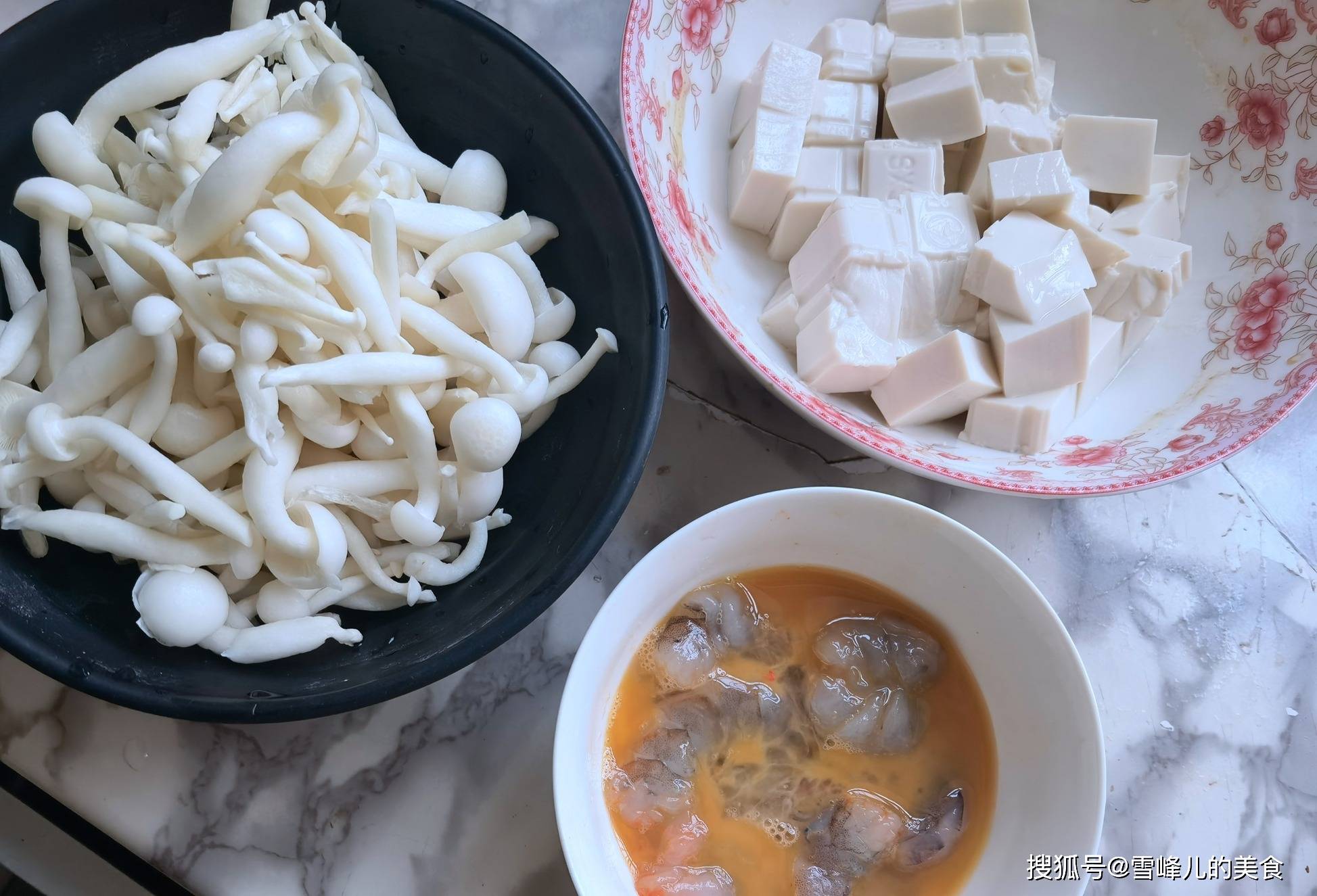 第一步:豆腐切成小块,白玉菇洗净,大虾去掉外皮,剥出虾肉放上少许蛋液抓匀备用。