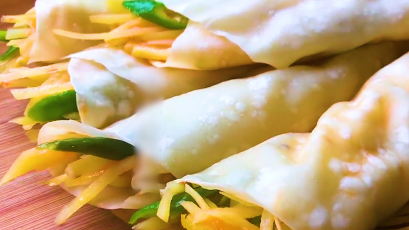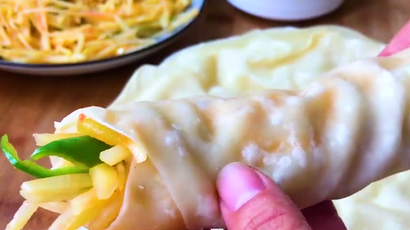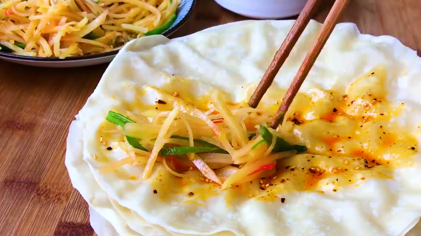 然后把蒸好的饼一张一张的揭开,这样做出的饼柔软而且筋道非常的好吃,我们可以卷上菜或者肉,想吃什么就卷什么。饼皮蒸好后就在上面一层辣椒油,不喜欢吃辣的可以不放,然后加一点土豆丝。这个土豆丝是我提前炒好的,大家喜欢吃什么菜就加什么菜。最后再给它卷一下。